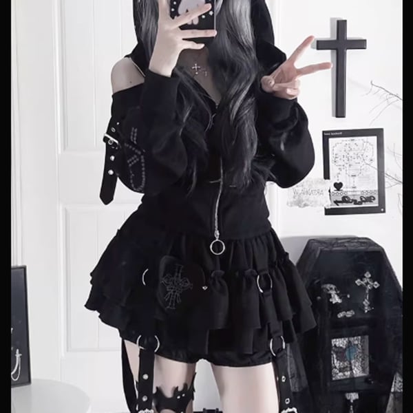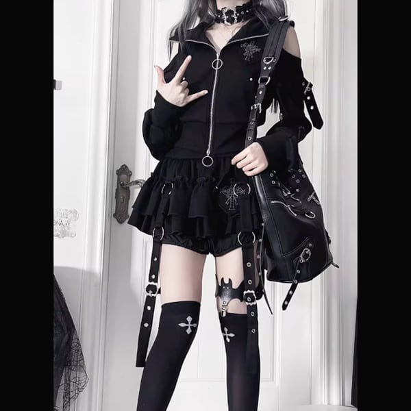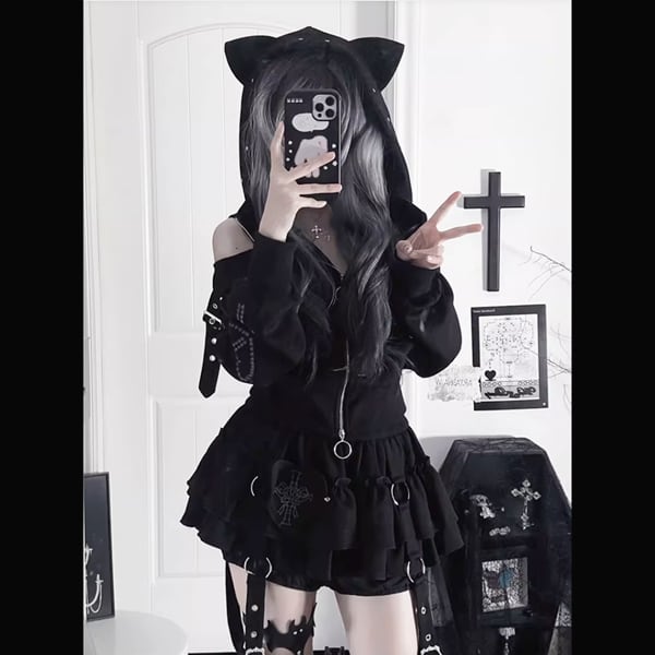 猫耳クロスジップオフショルゴシックショートパーカー(lli_6658)