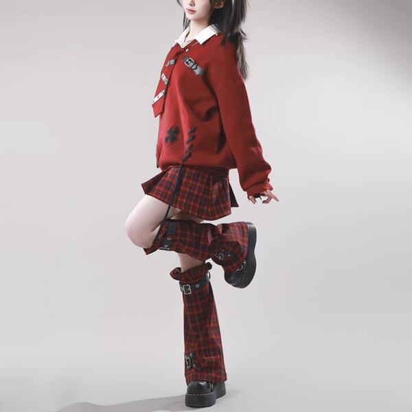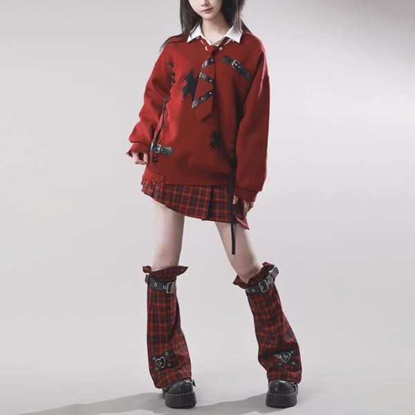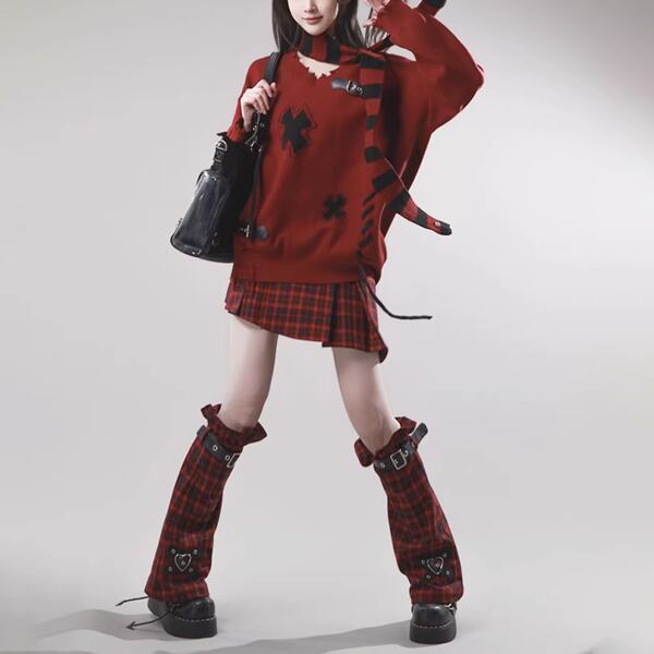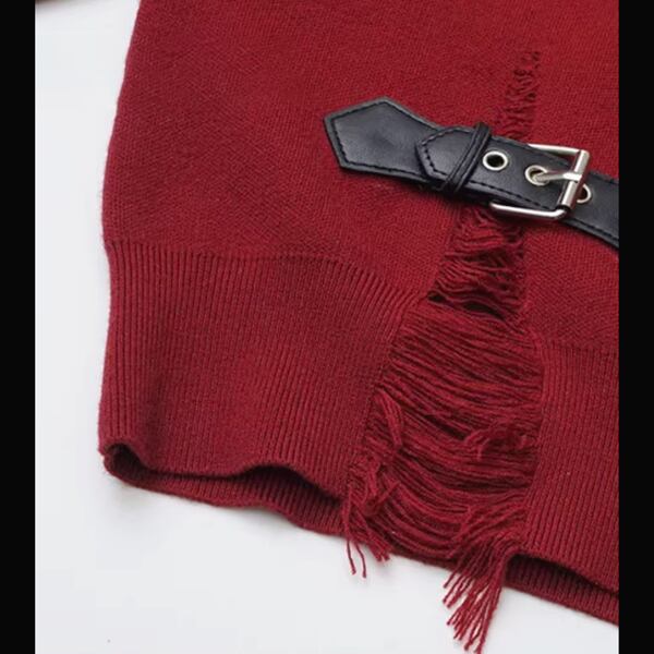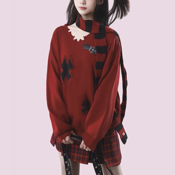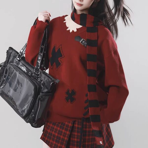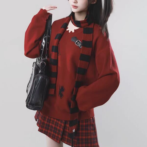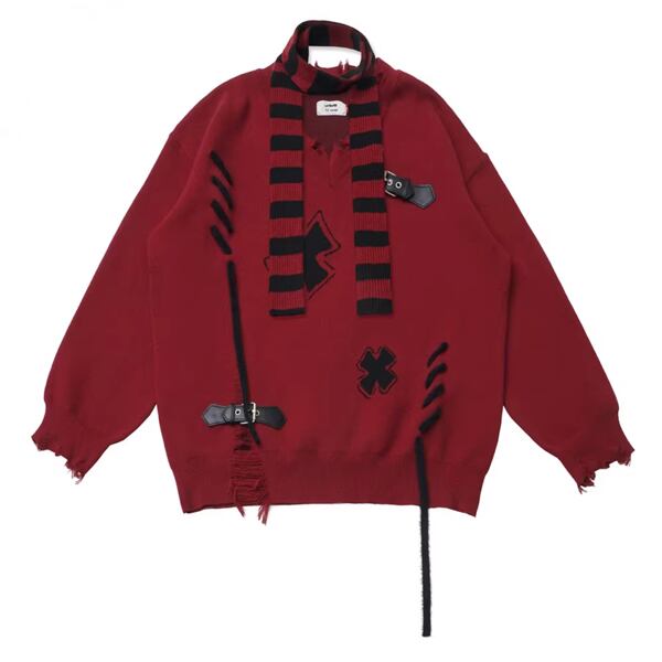 セットアップダーククロスダメージマフラーレッドニットプルオーバー(lli_6674)