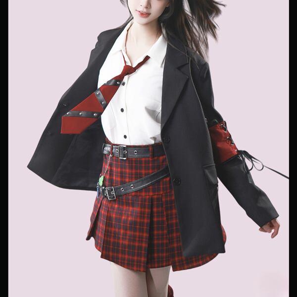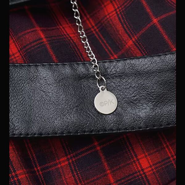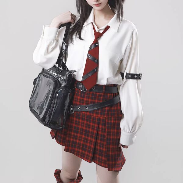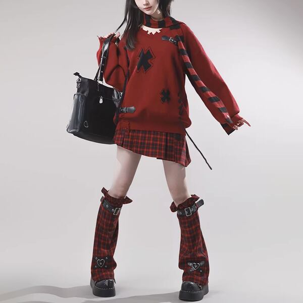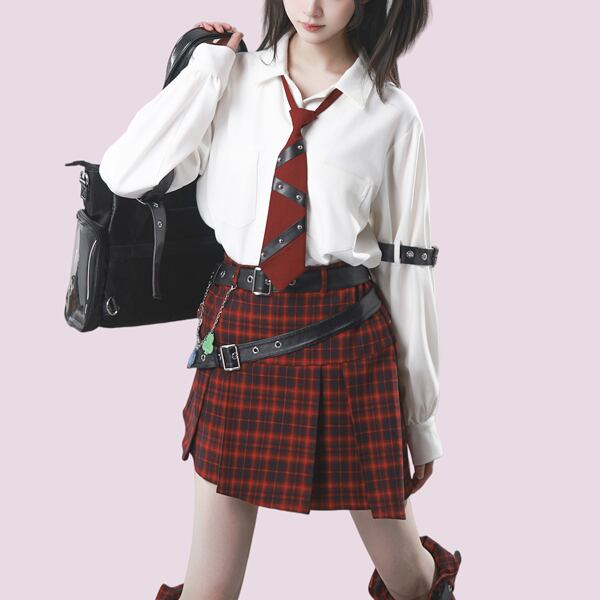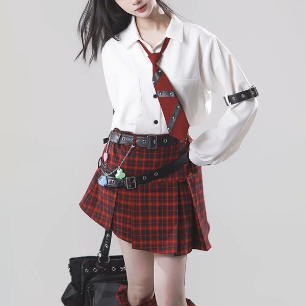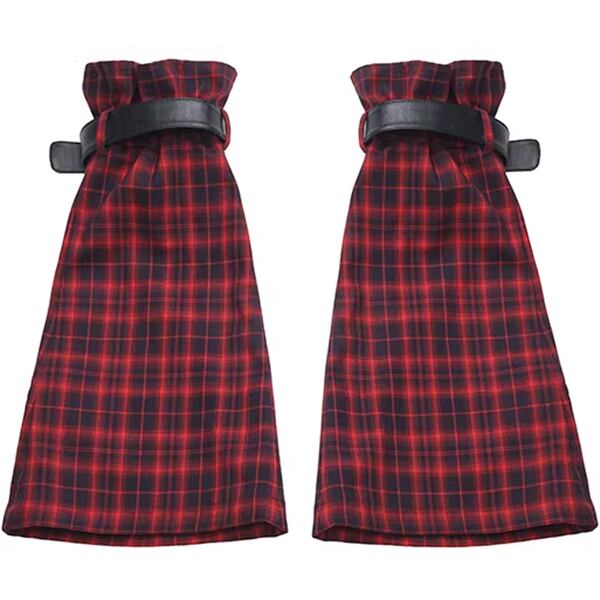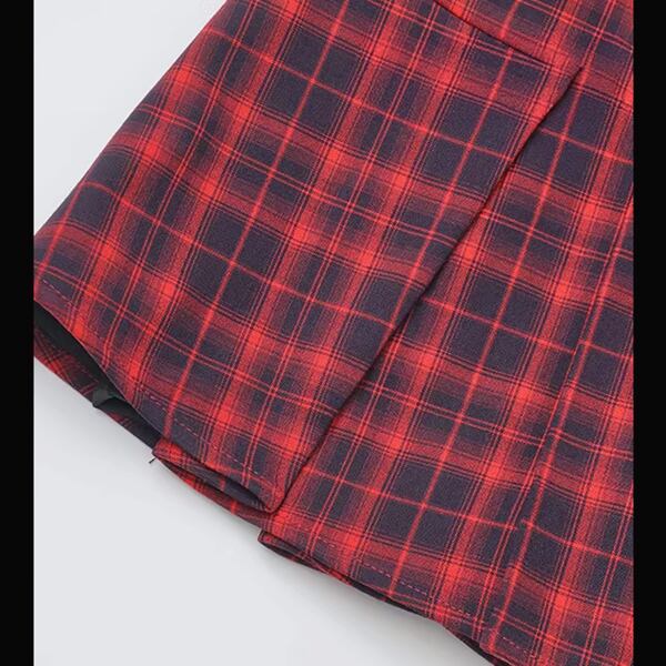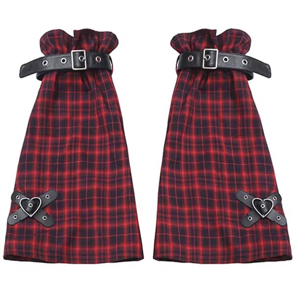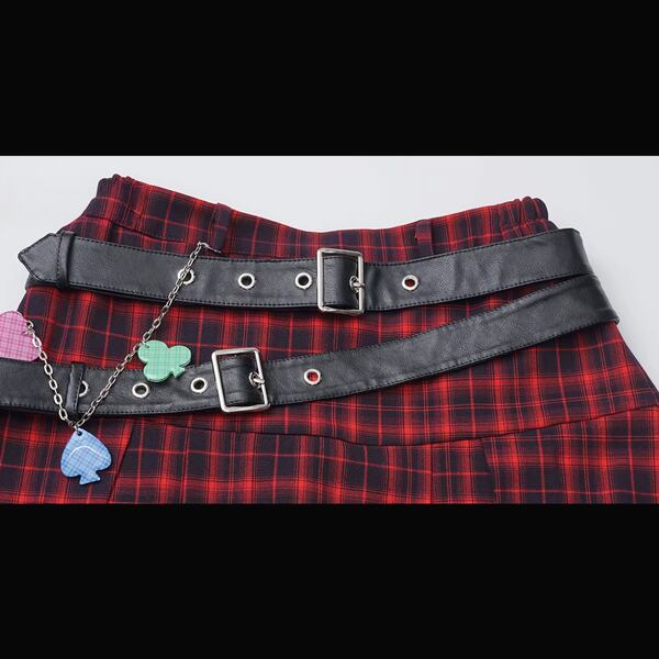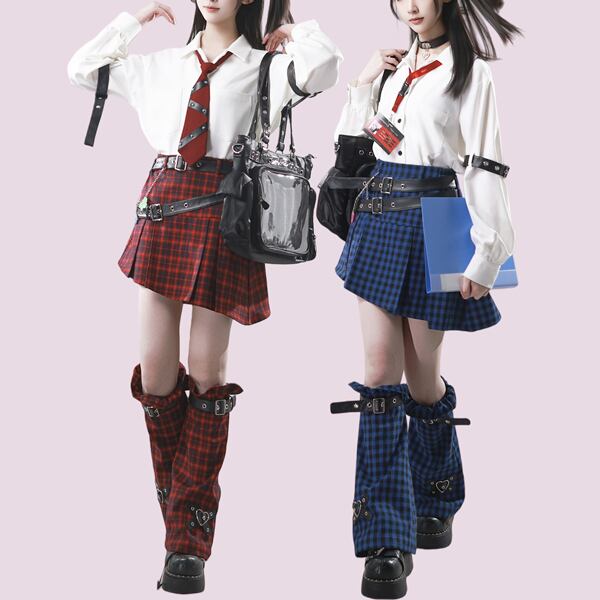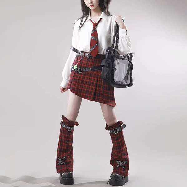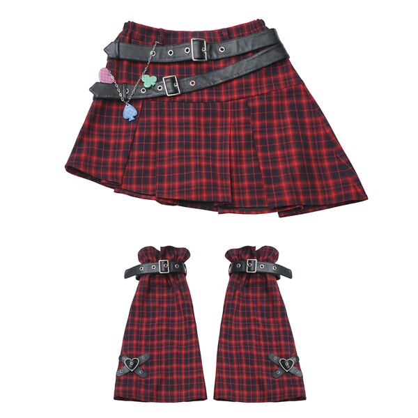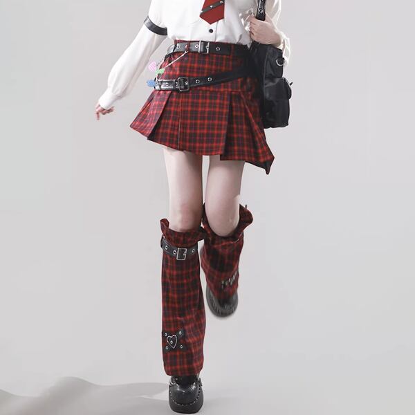 ダブルベルトレッドチェックレッグウォーマー付きプリーツミニスカート(lli_6696)