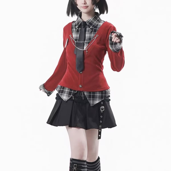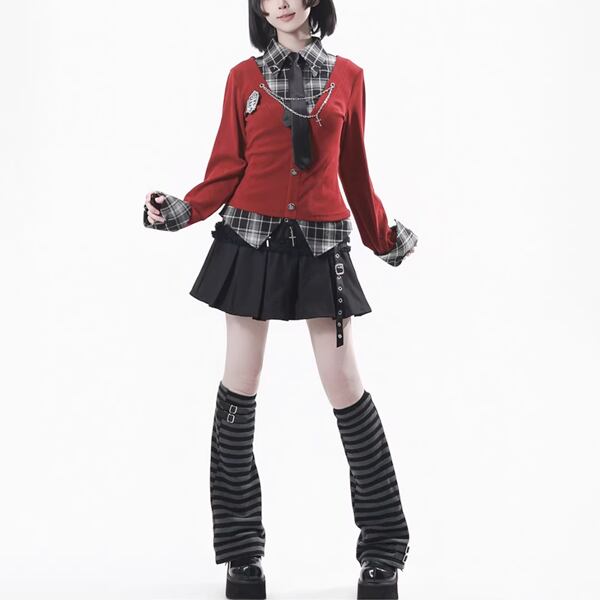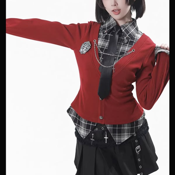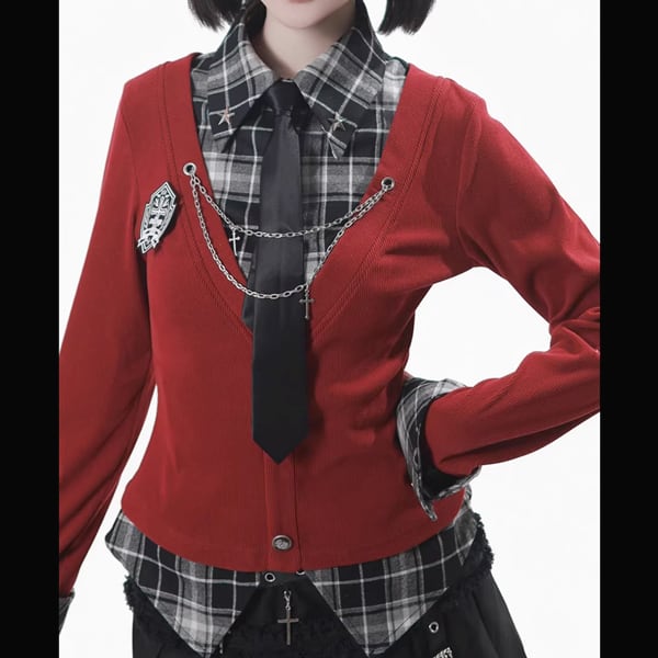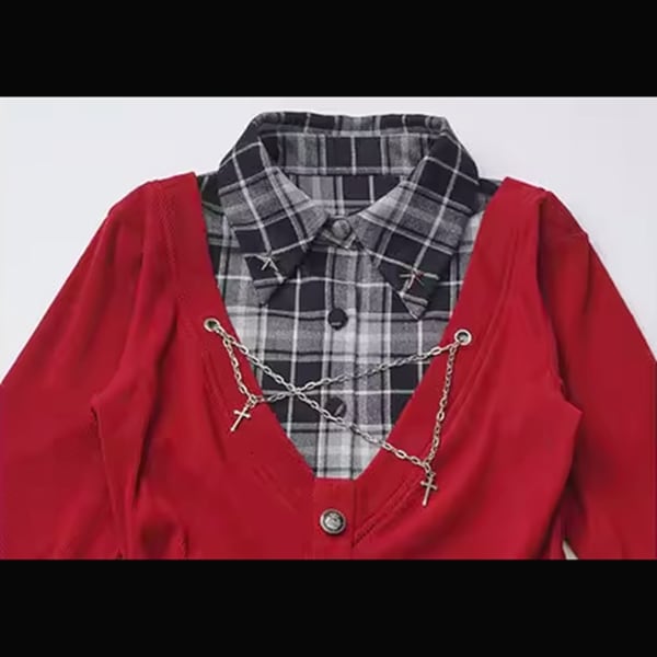 チェックレイヤードウエストシェイプレッドニット(lli_6699)