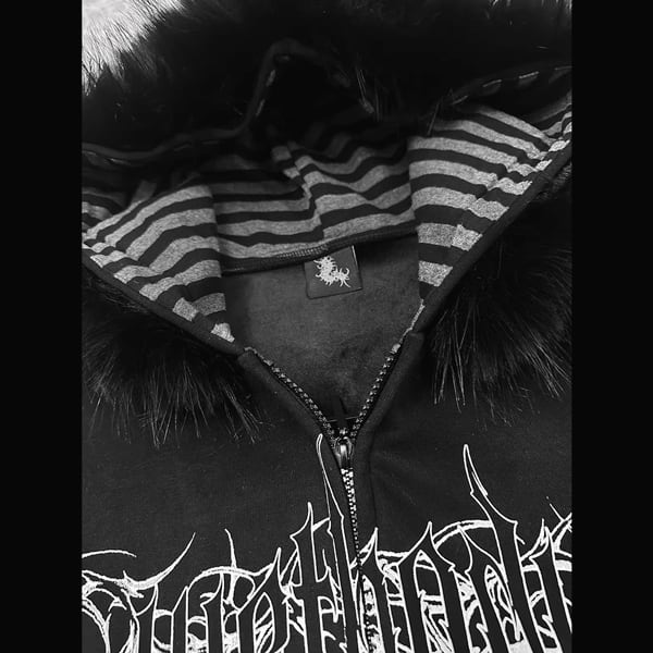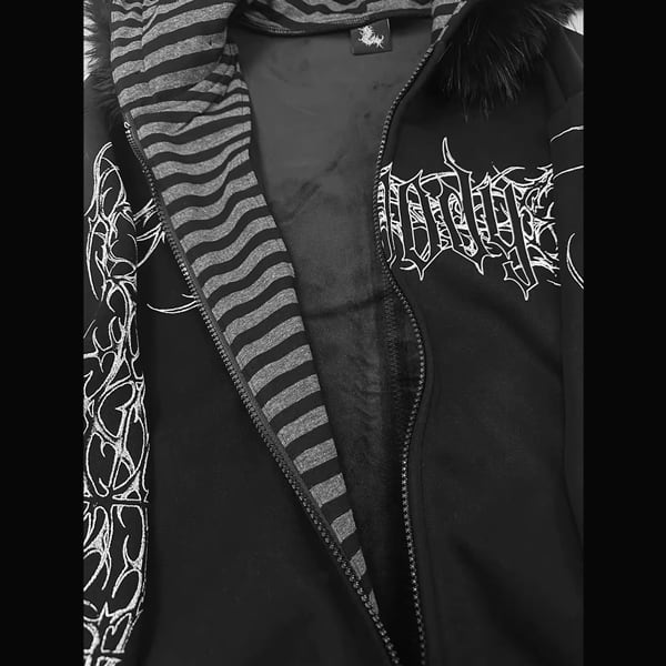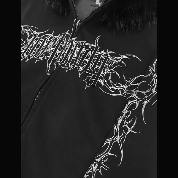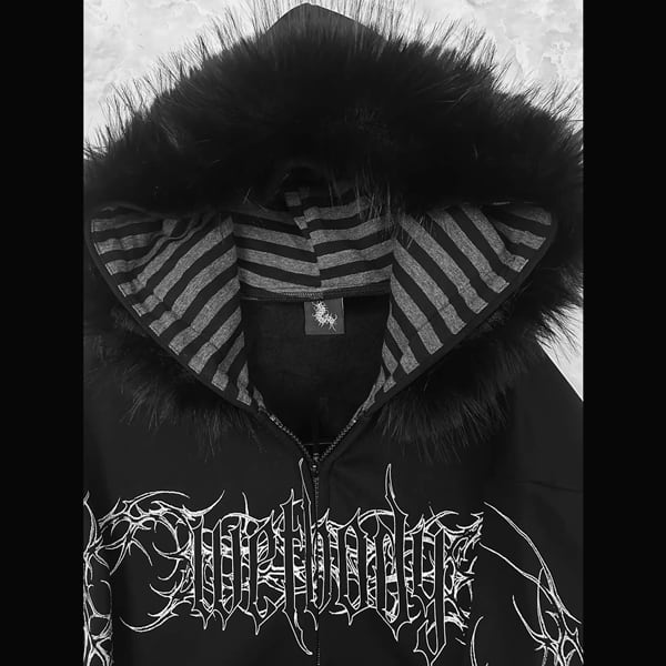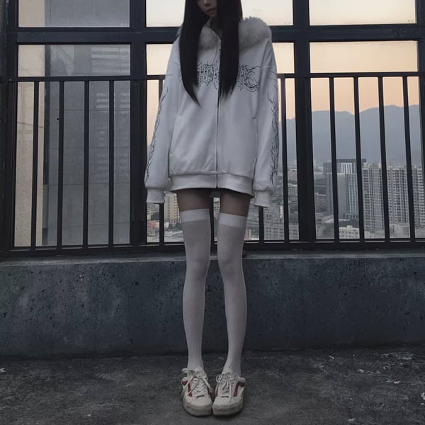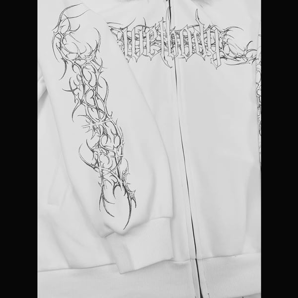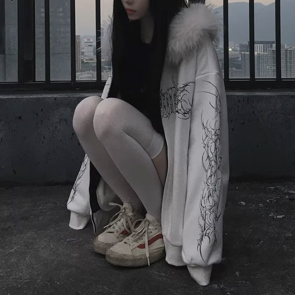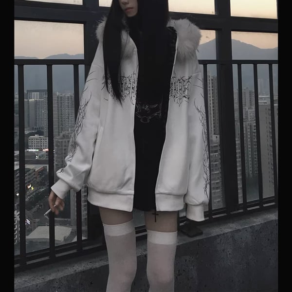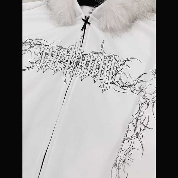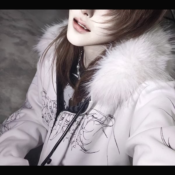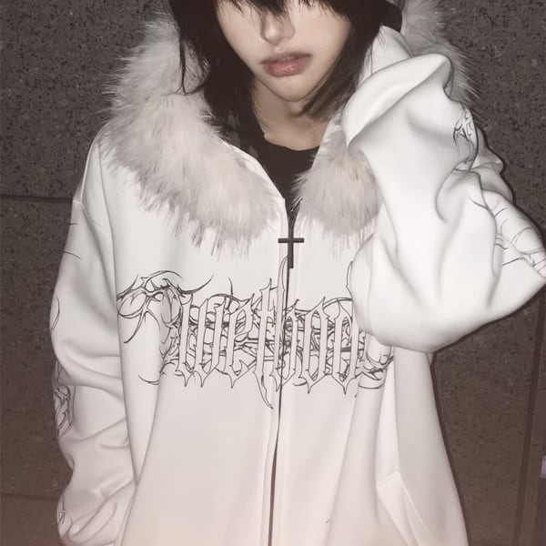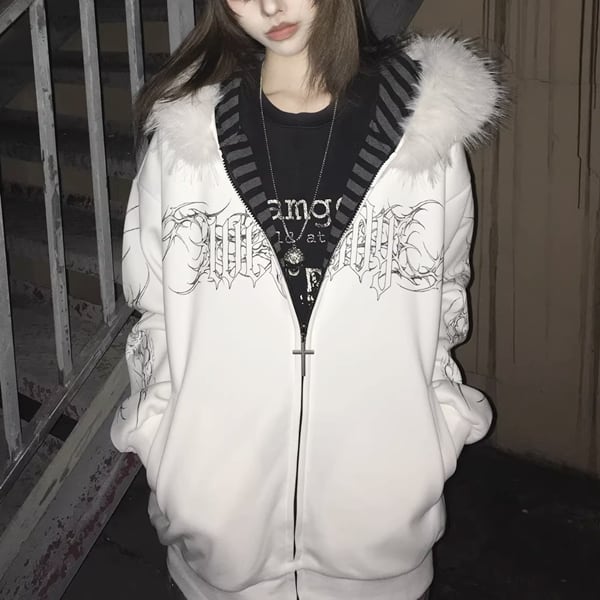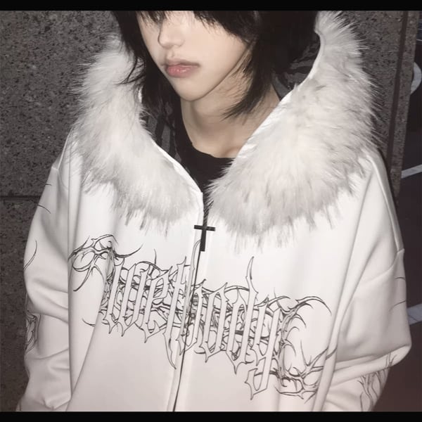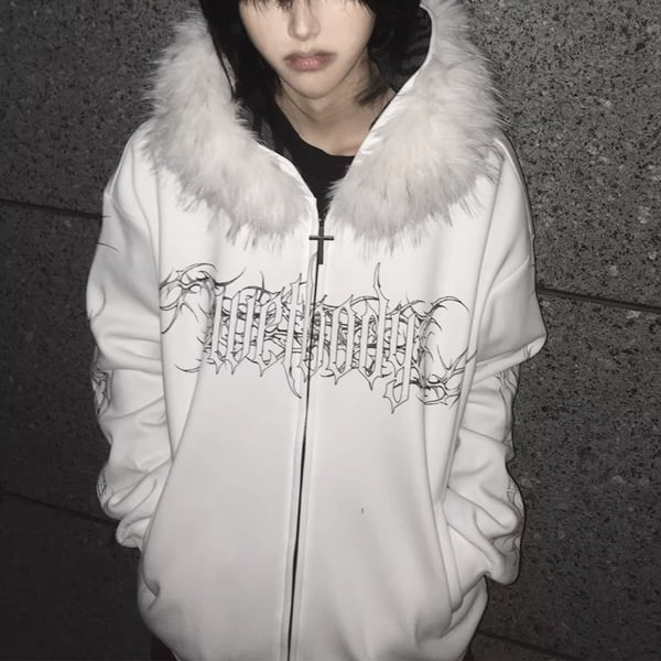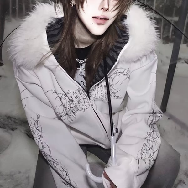 ファーフード刺青プリント ゴシックパンクホワイトジップパーカー(lli_6626)