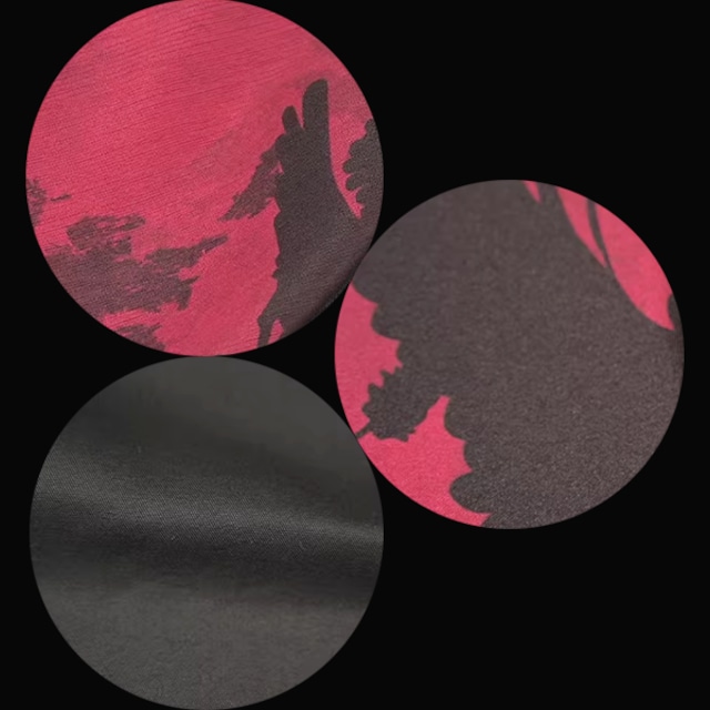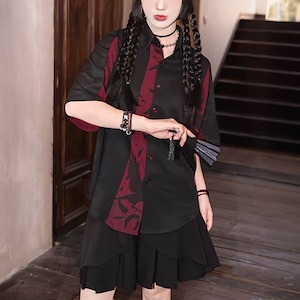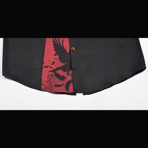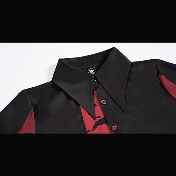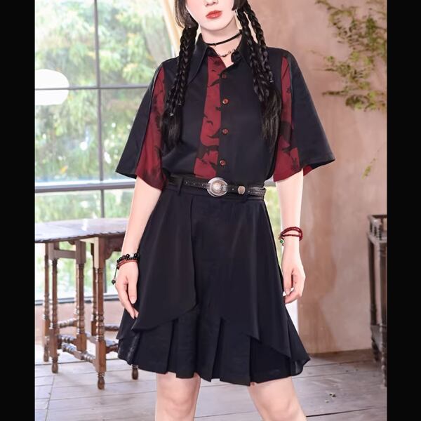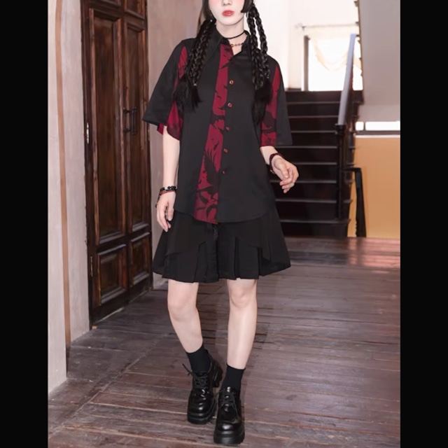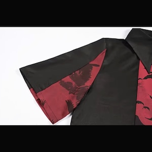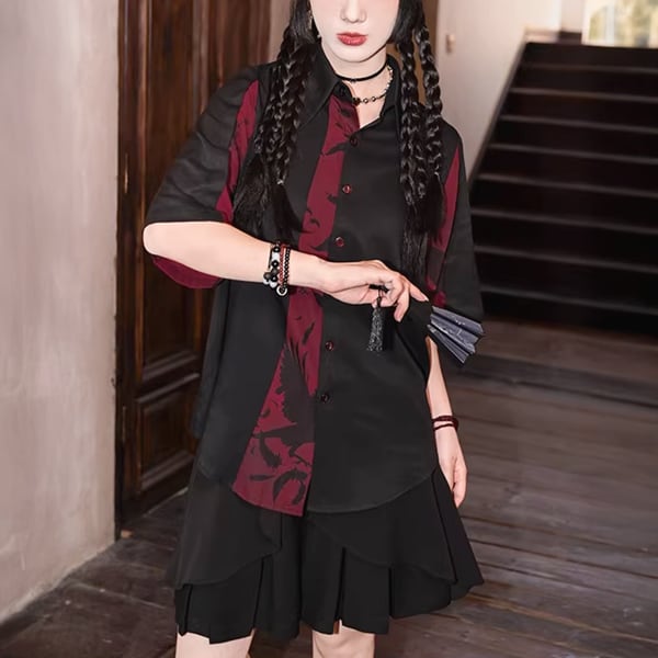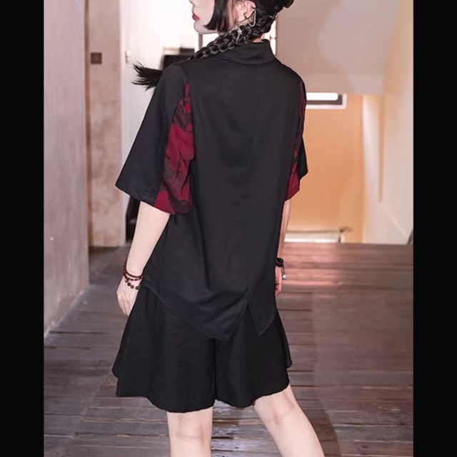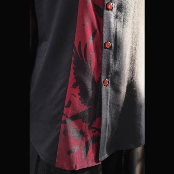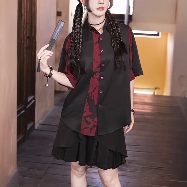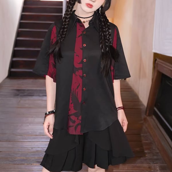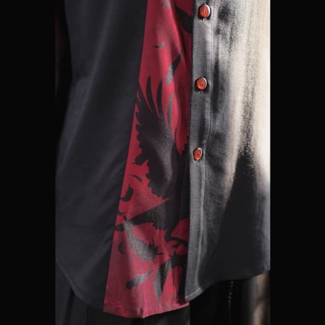 黒紅カラスプリント チャイナ風ルーズシャツ(lli_6727)