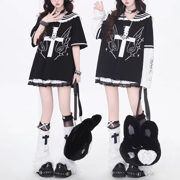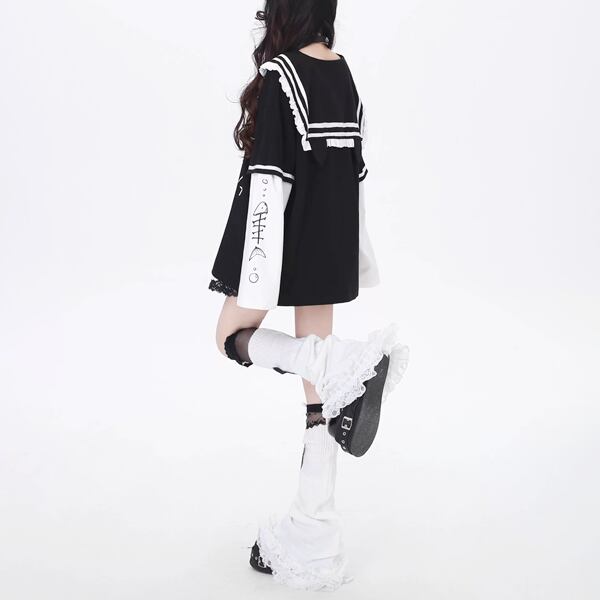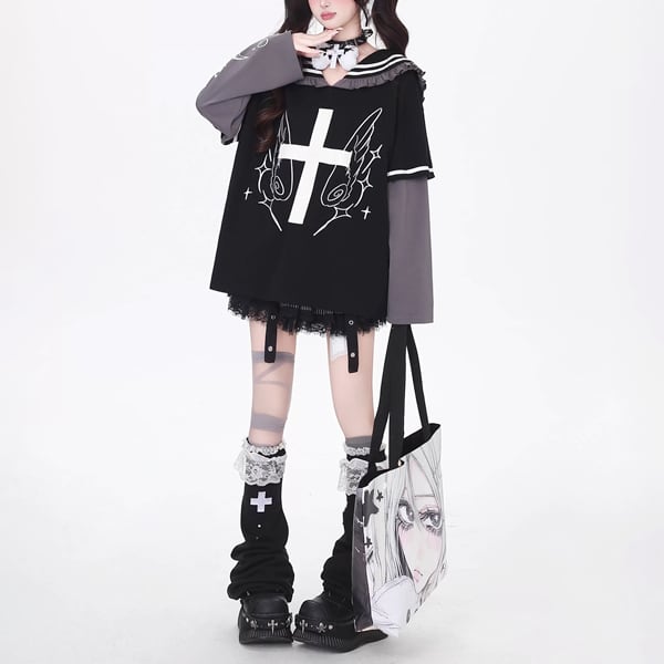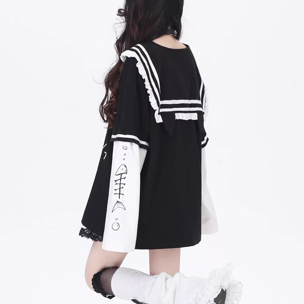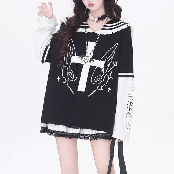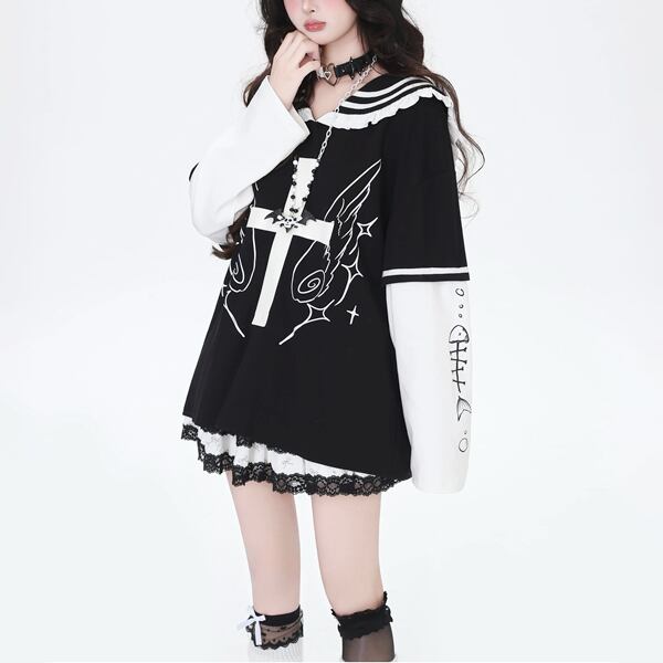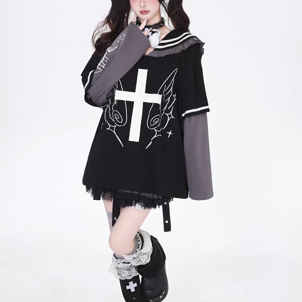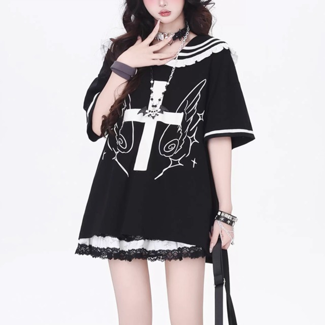 セーラーカラー クロスプリントセパレートスリーブ 2wayトップス(2カラーあり)(lli_6734)