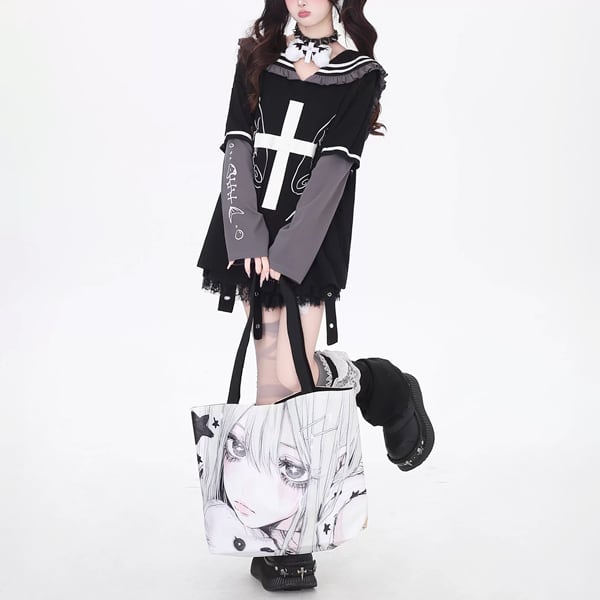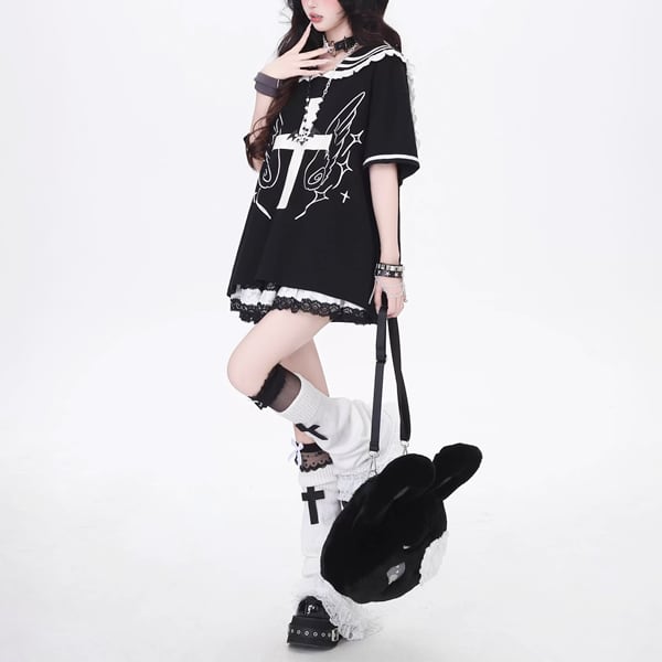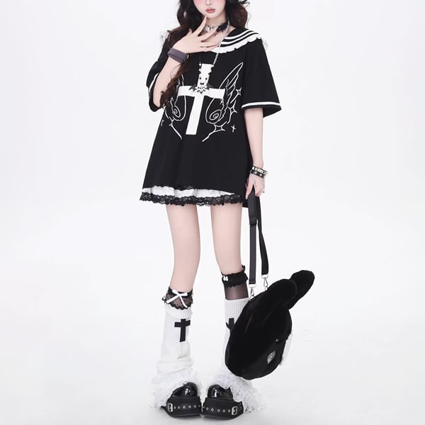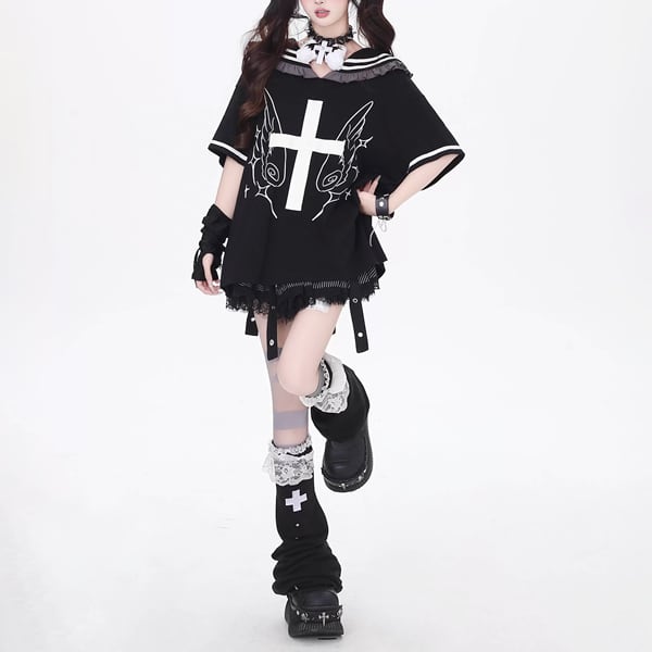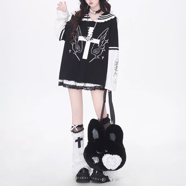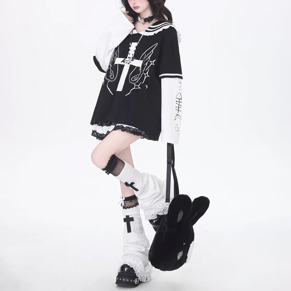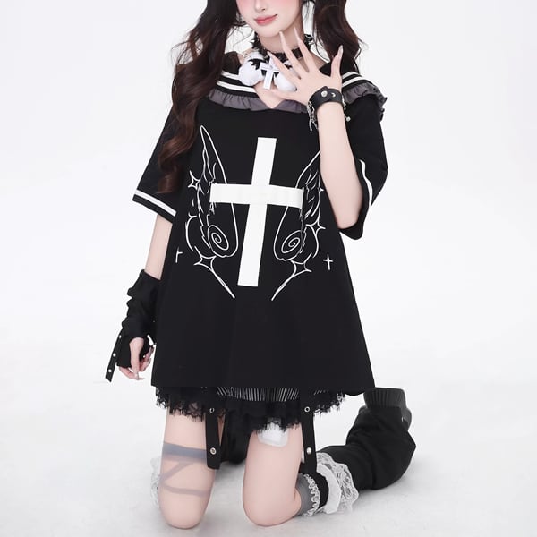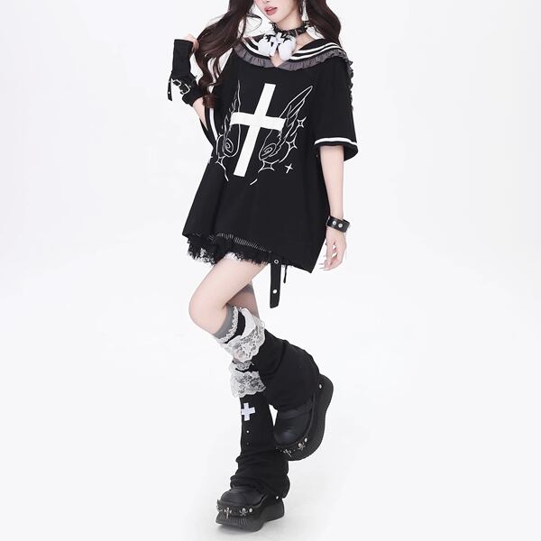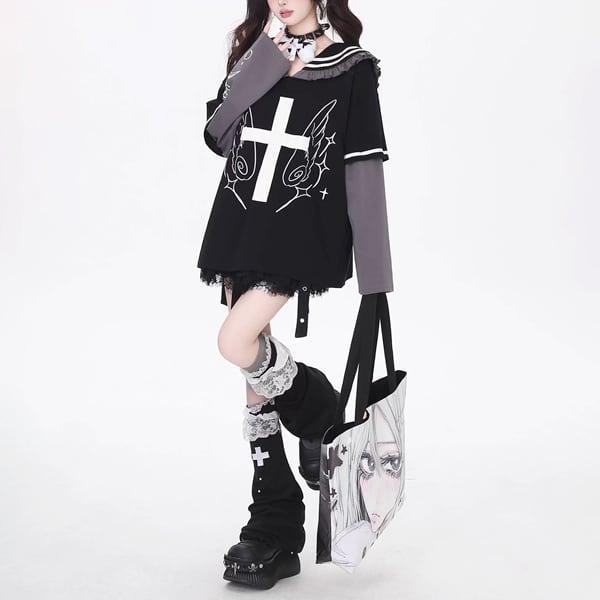 セーラーカラー クロスプリントセパレートスリーブ 2wayトップス(2カラーあり)(lli_6734)