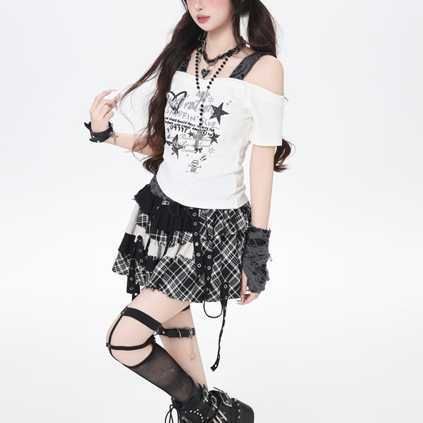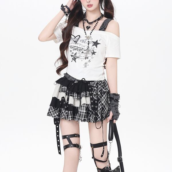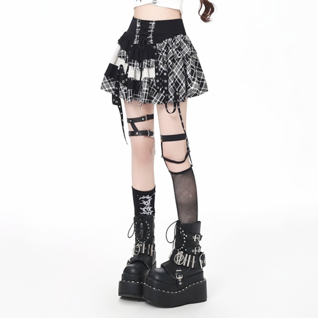 チェック切替 編み上げアシンメトリーミニスカート(lli_6741)