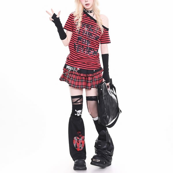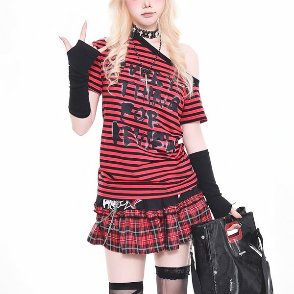 パンクレッドボーダーショートスリーブカットソー(lli_6758)