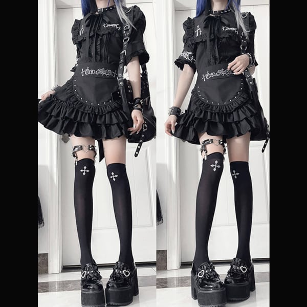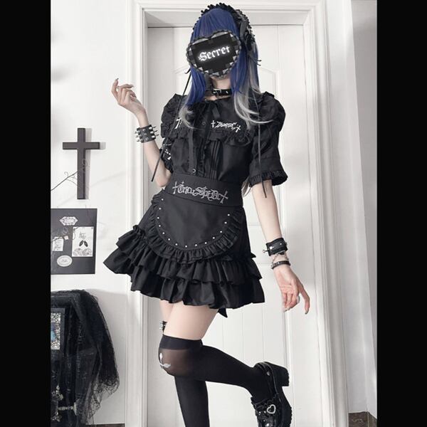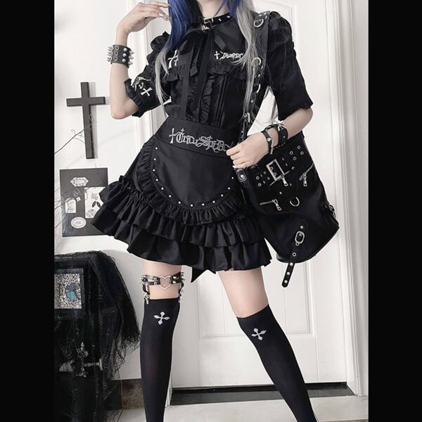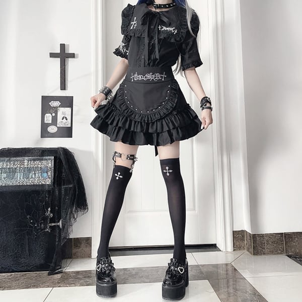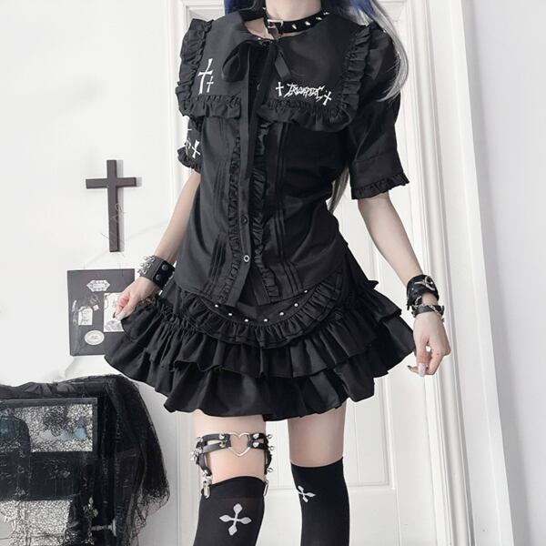 ブラックゴシッククロス刺繍フリルショートスリーブブラウス(lli_6770)