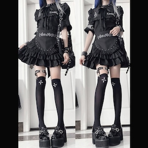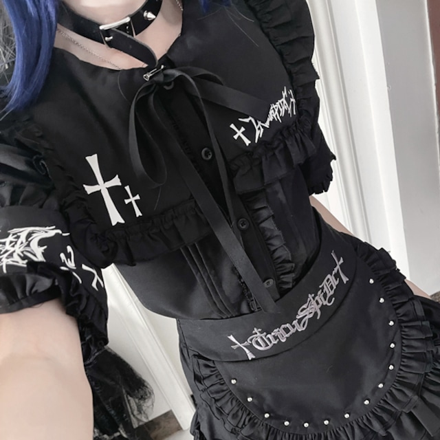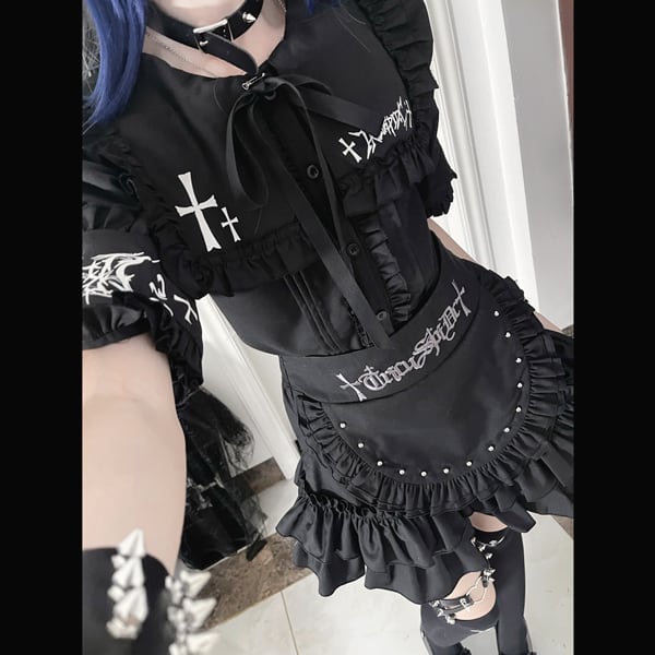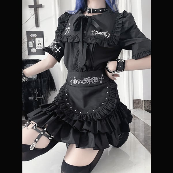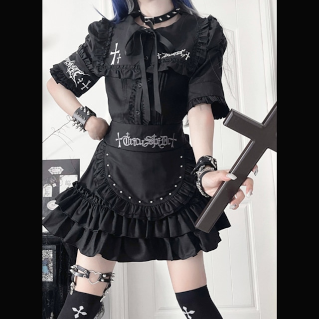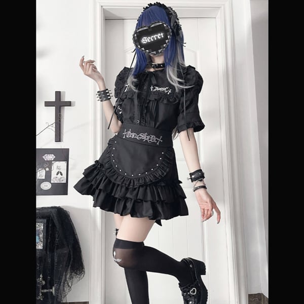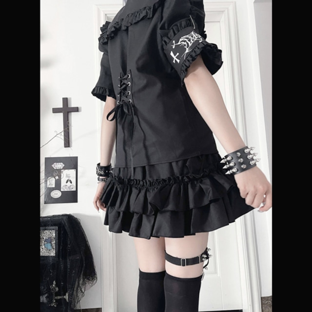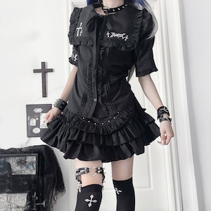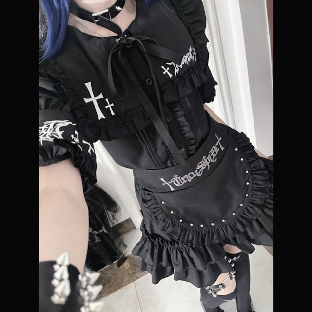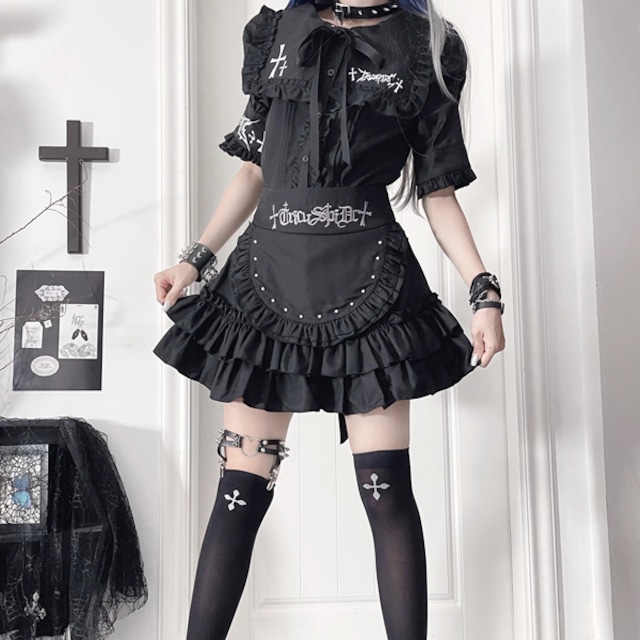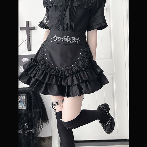 ブラックフリルエプロンデザイン ハイウエストゴシックスカート(lli_6771)