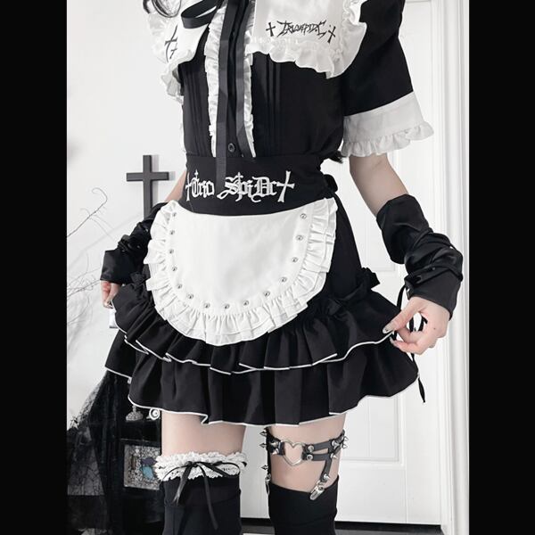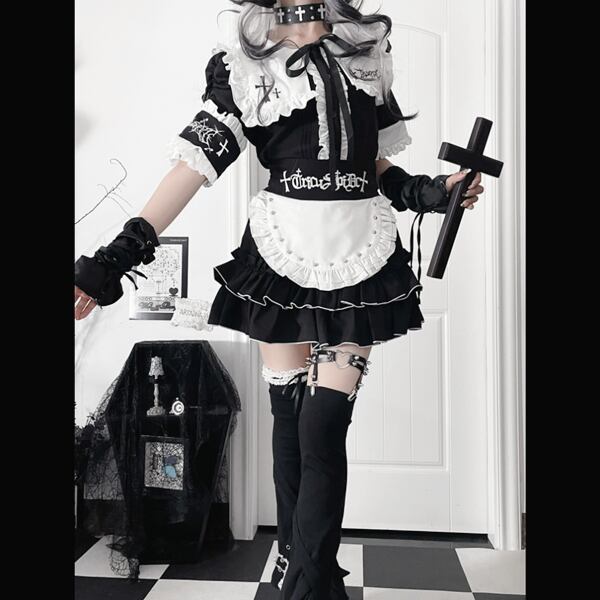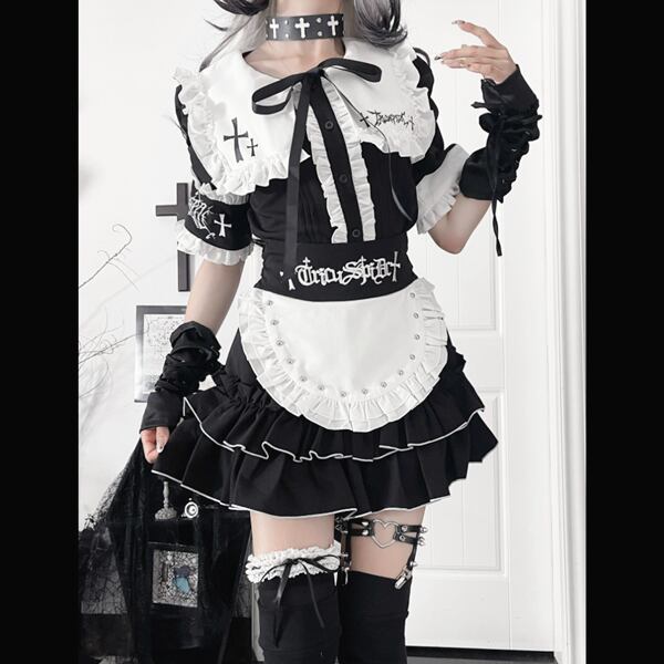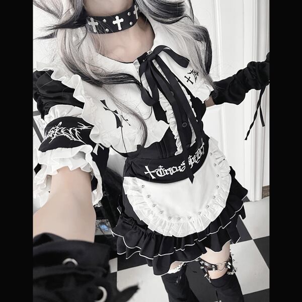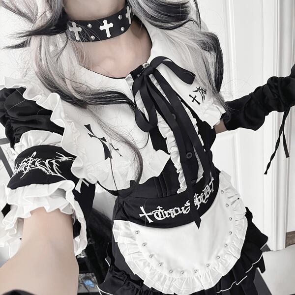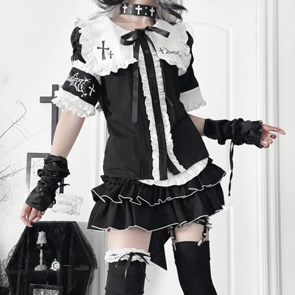 ブラックホワイトゴシッククロス刺繍フリルショートスリーブブラウス(lli_6792)
