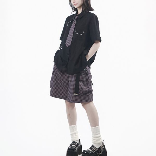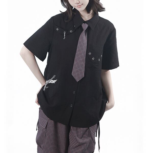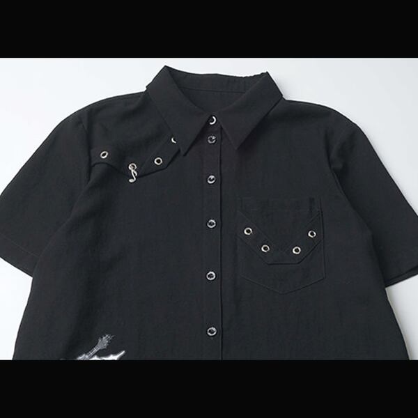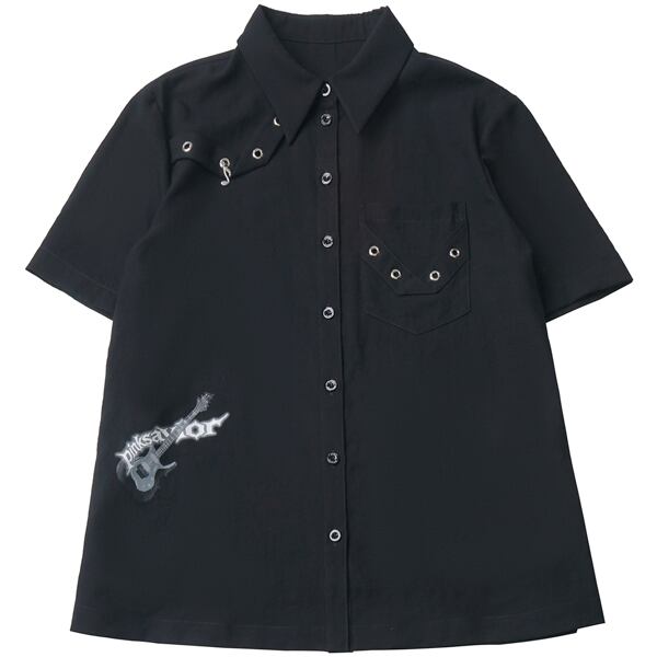 ギタープリント ピアスデザインサブカルブラックシャツ(lli_6828)