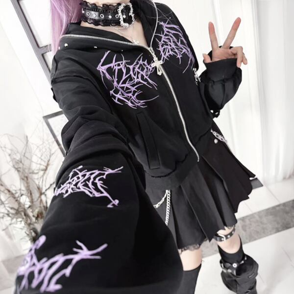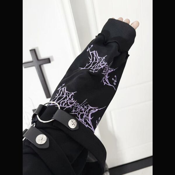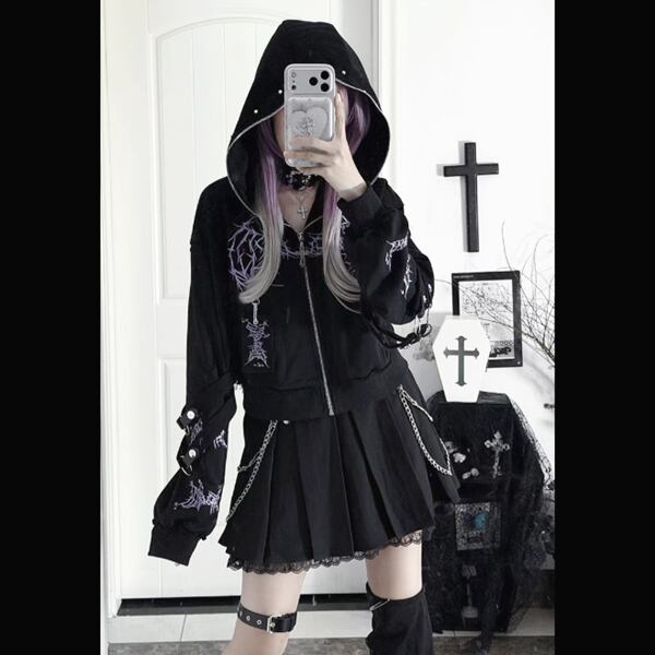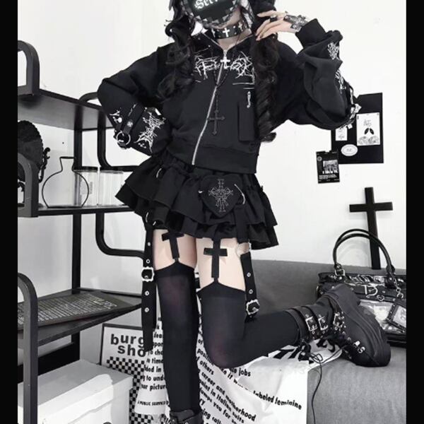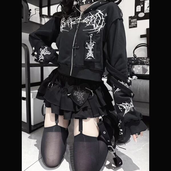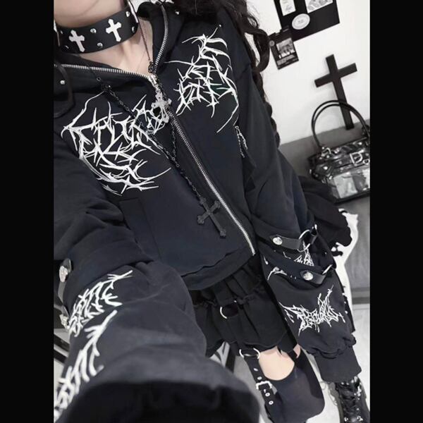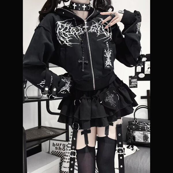 スタッズ×刺繍 スリーブストラップクロップドジップパーカー(2タイプあり)(lli_6835)