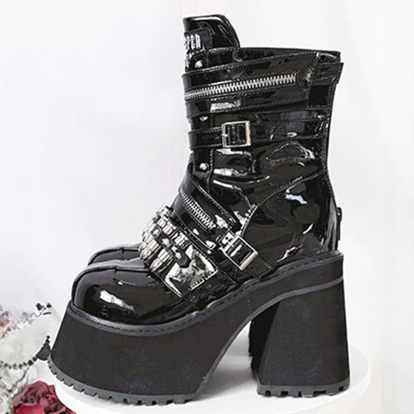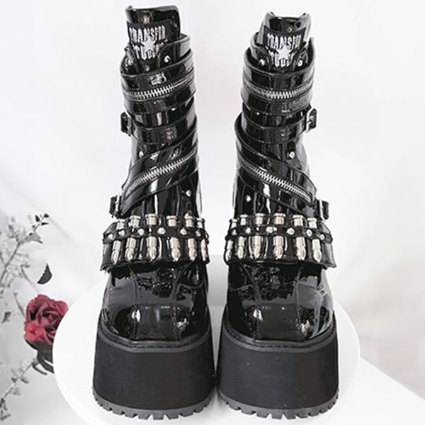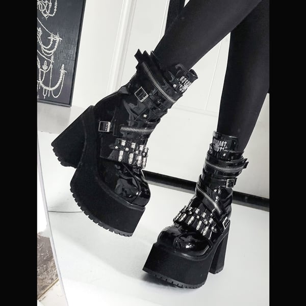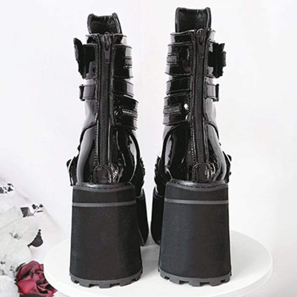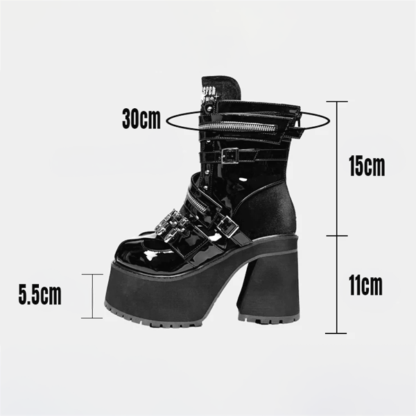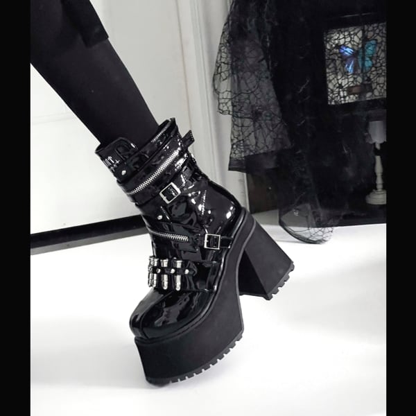 バレットベルクロジッパー厚底 ゴシックブラックショートブーツ(lli_6841)