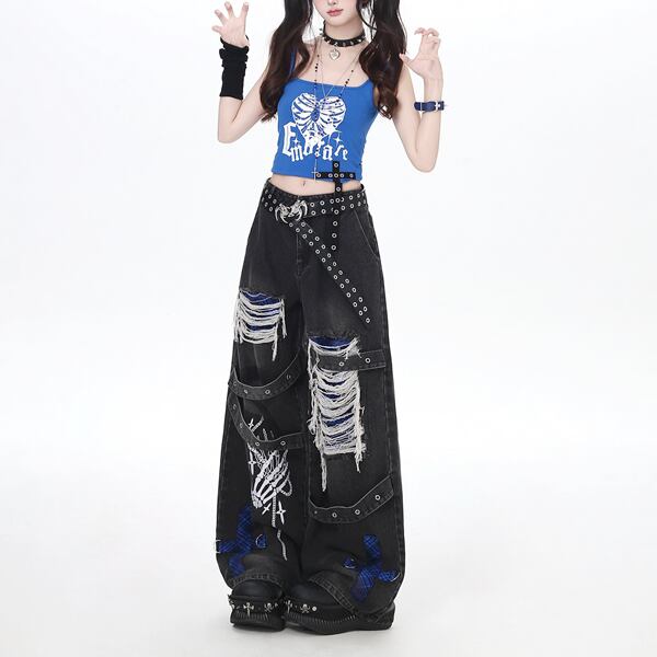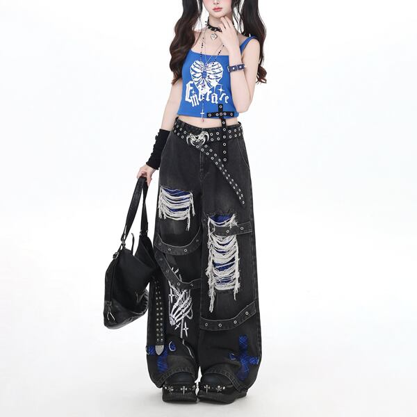 ▼別のタイプ(ダメージ加工 チェーンデザイン ワイドデニムパンツ(2タイプあり)(lli_6737)は以下からご覧ください▼