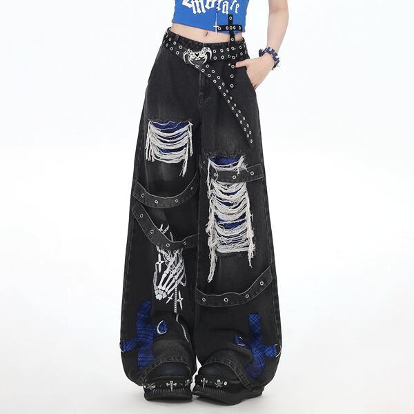 ブルーチェックダメージ加工 チェーンデザイン ワイドデニムパンツ(lli_6842)