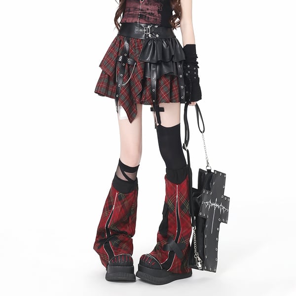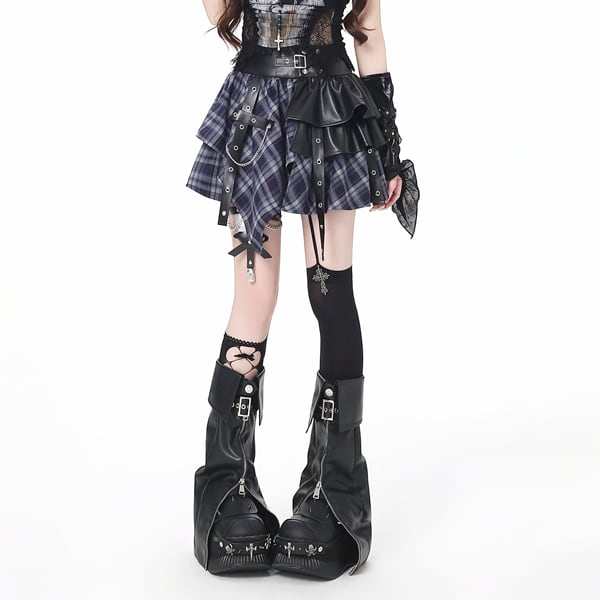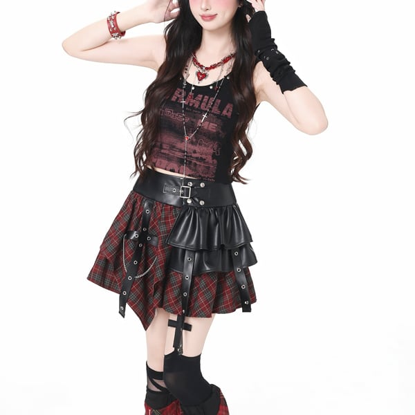 チェック×PUレザー レイヤードミニスカート(3カラーあり)(lli_6846)