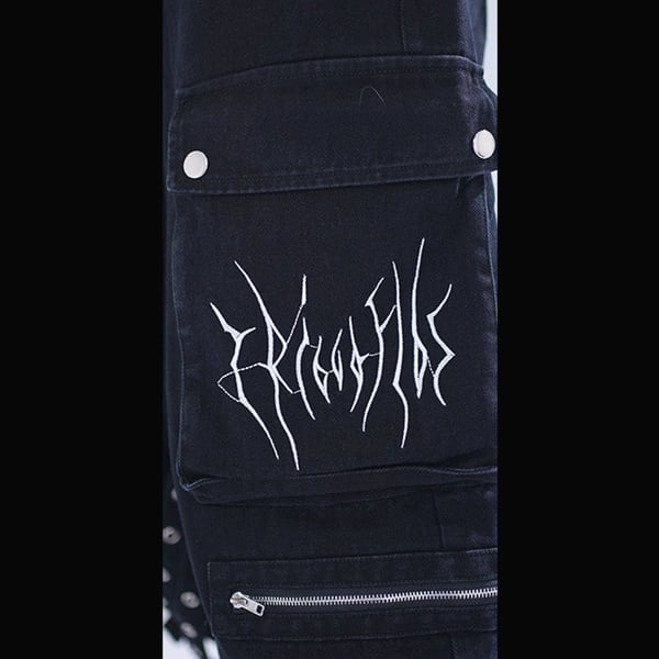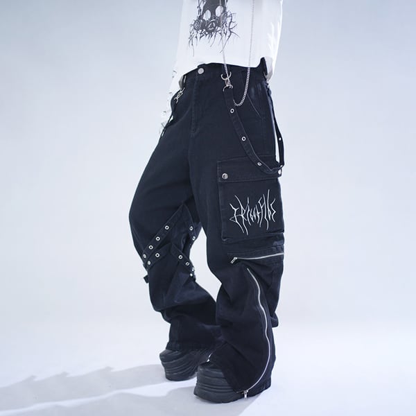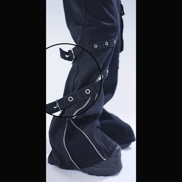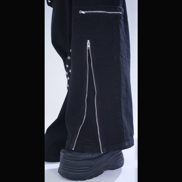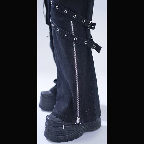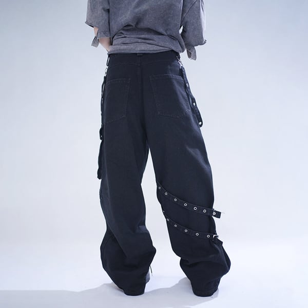 ブラックストラップデザイン ダークワイドデニムパンツ(lli_6855)