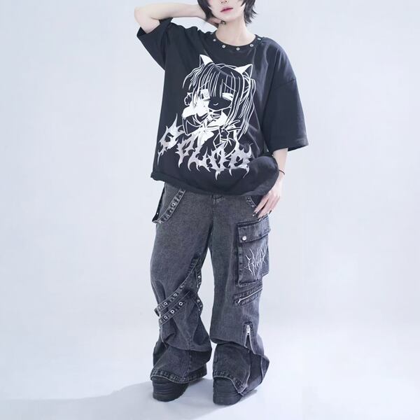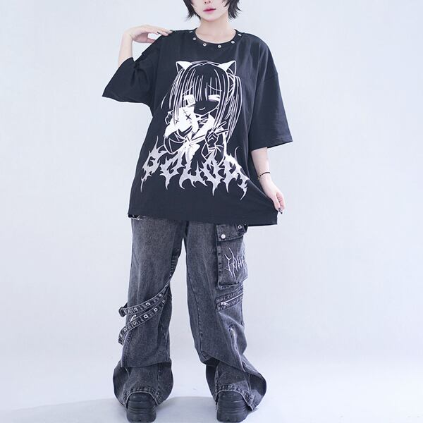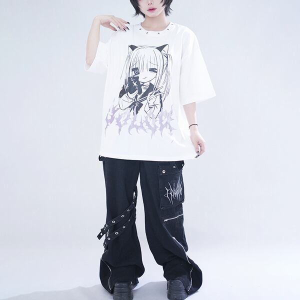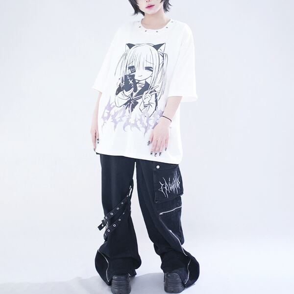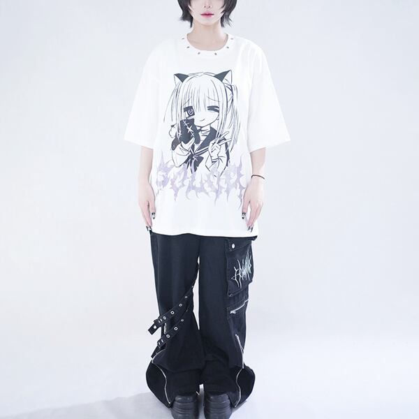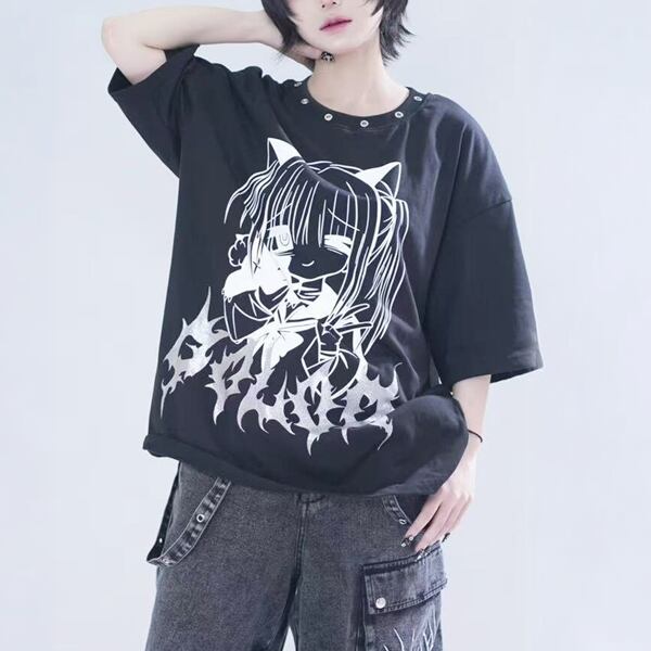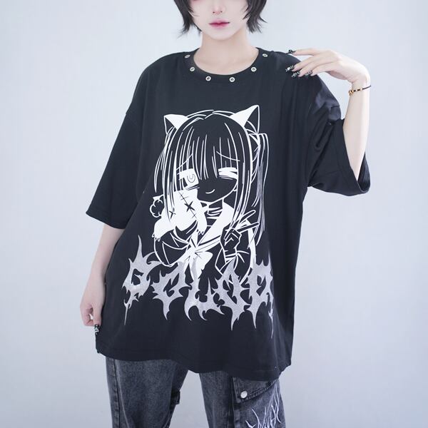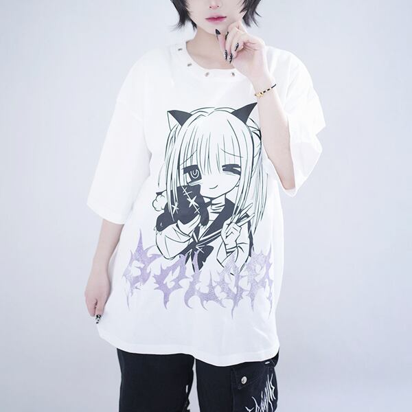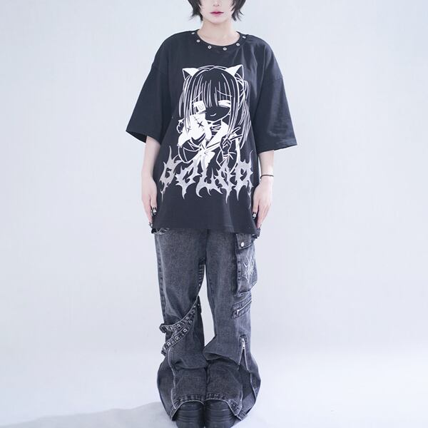 キャットガールグラフィック オーバーサイズTシャツ(2カラー)(lli_6856)