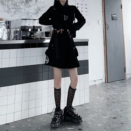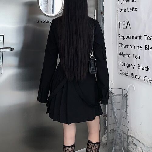 ショート丈ダブルフラップポケットシャツサイドプリーツサスペンダーベルトスカートツーピースセットアップ(lli_303)