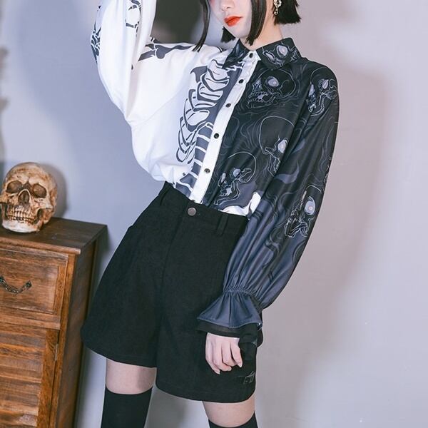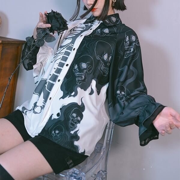 スケルトンプリントバイカラーフリルシャツ(lli_559)