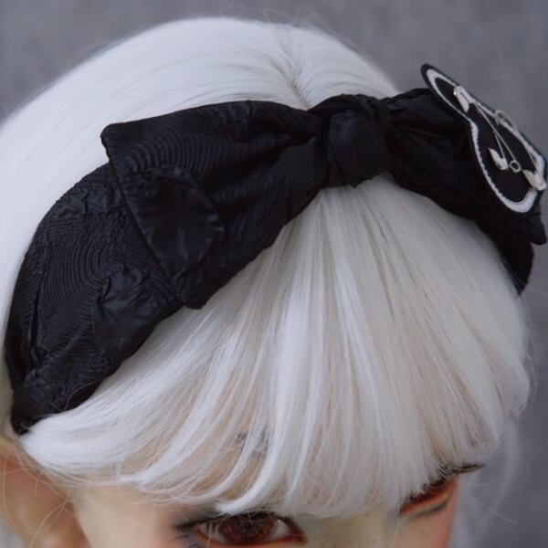安ピンブラックホワイトステッチハートリボンカチューシャ(lli_1563)