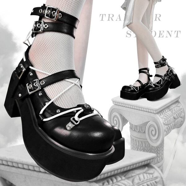マットブラックトリプルストラップアクセントコードチャンキーヒールシューズ(コードは3色付属)(lli_2134)