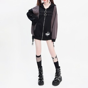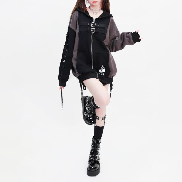 バイカラーワンサイドレースアップスリーブダブルバックルストラップジップアップパーカー(lli_3437)