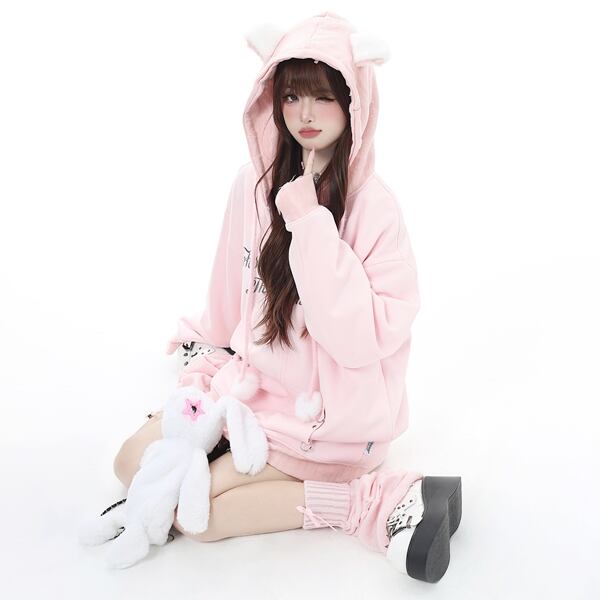 耳付きフーディジップアップリングオーナメントポンポンコードジップアップパーカー(lli_3445)