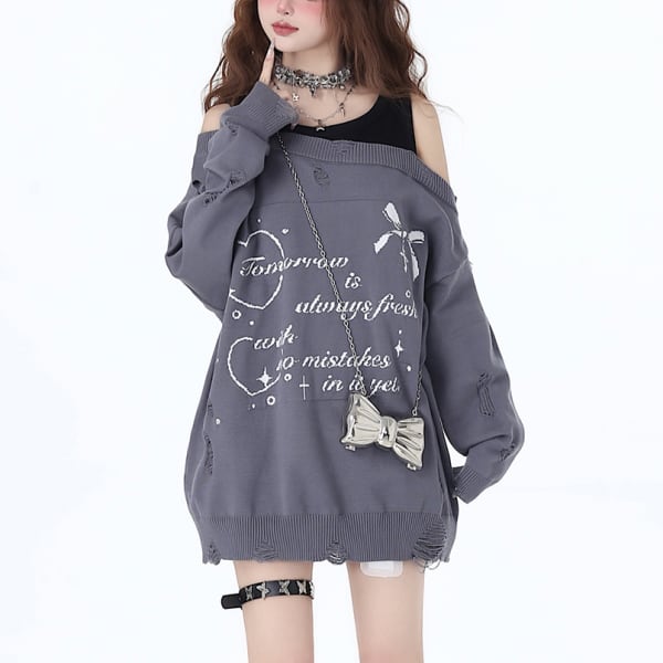 グレーオフショルダーフェイクツーピースダメージニット(lli_4024)
