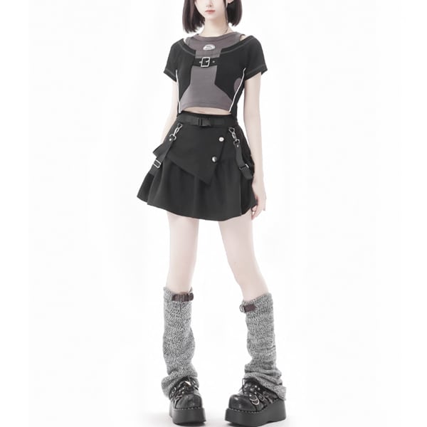 バストバックルフェイクレイヤードショートスリーブショートトップス(lli_4435)
