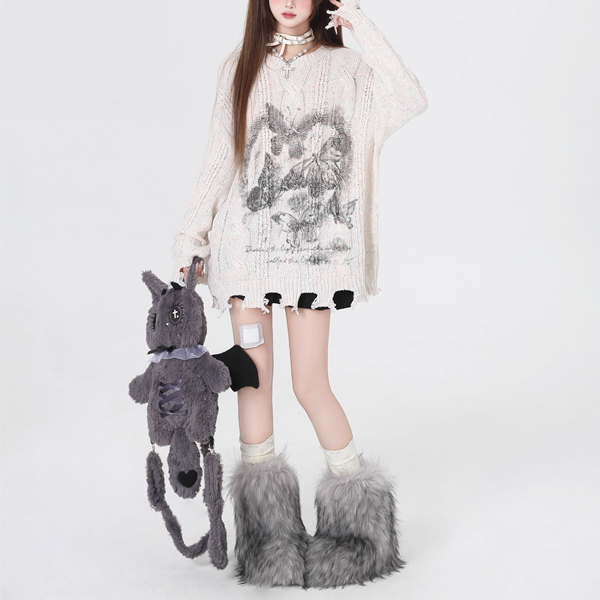 バタフライグラフィックダメージエッジオフホワイトニット(lli_4965)