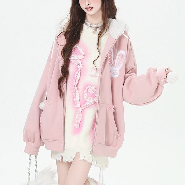 猫耳ボアフーディジップアップポンポンコード裏起毛アイパッチラビットピンクパーカー(lli_5340)